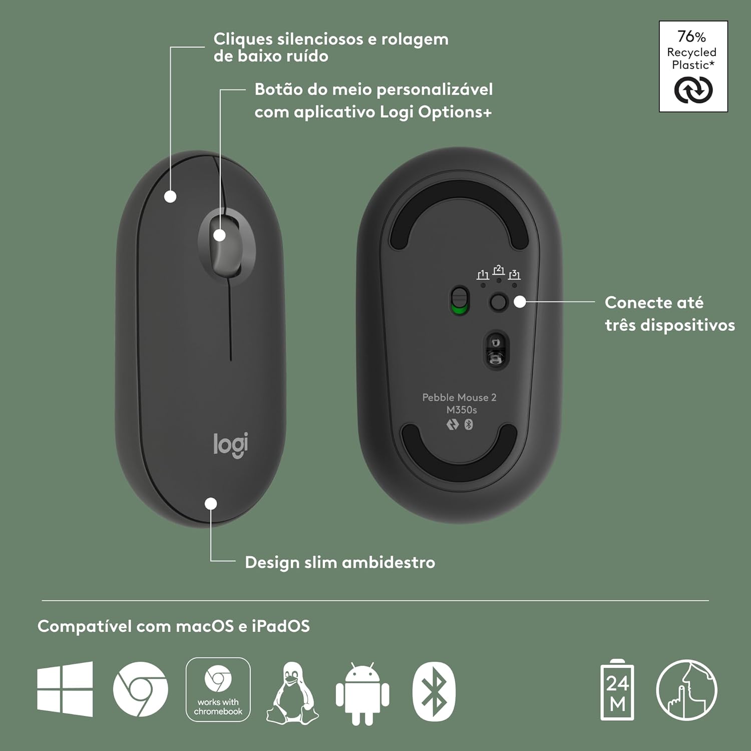 - Impressione todos com cliques silenciosos: Deixe seu trabalho falar mais alto que seus cliques; o Pebble Mouse 2 M350s é um mouse de baixo ruído com tecnologia Silent Touch que remove 90% do ruído de cliques.