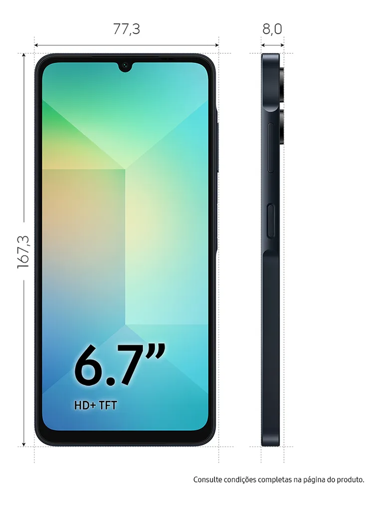 Com um design fino e moderno o, Galaxy A06 ainda conta com o a nova função de leitor de impressão de digital.